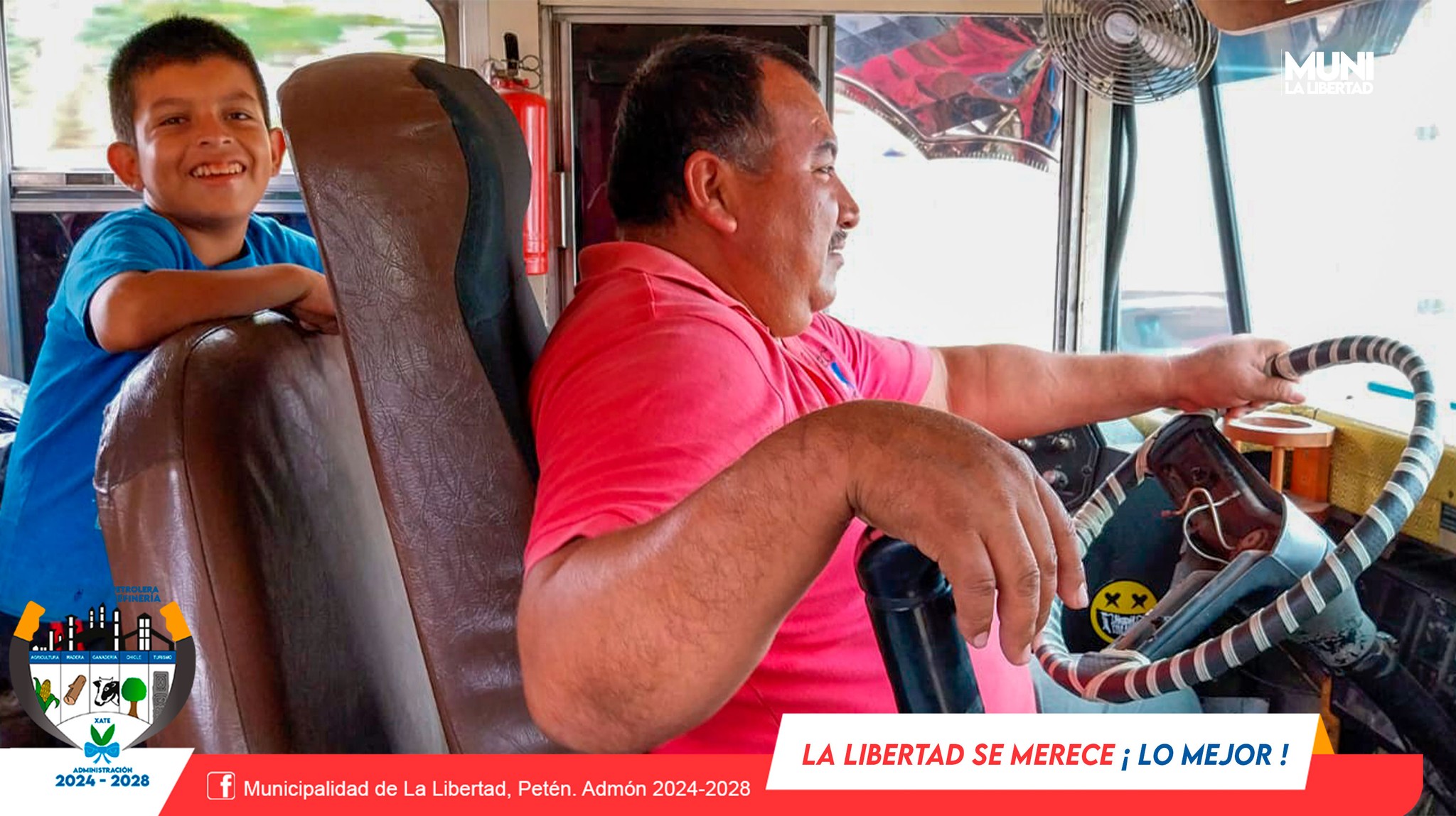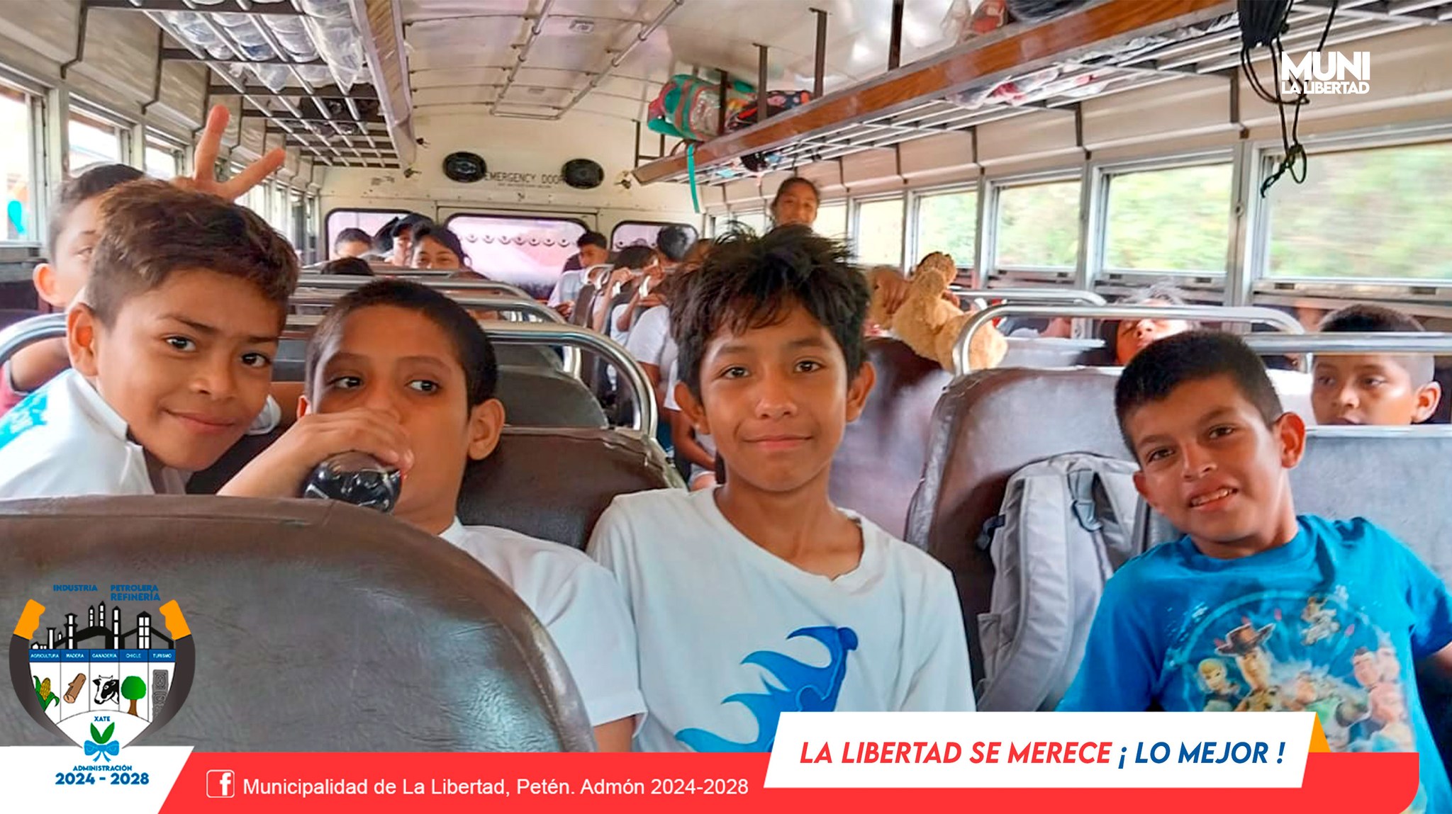 La Municipalidad de La Libertad, Petén. Admón 2024-2028 presidida por el Sr. Yony Maldonado Calderón apoya con transporte gratuito a grupo de niños y padres de familia de Barrio Santa Cruz quienes participaron en actividad deportiva en el Complejo Maya Santa Elena, Petén.