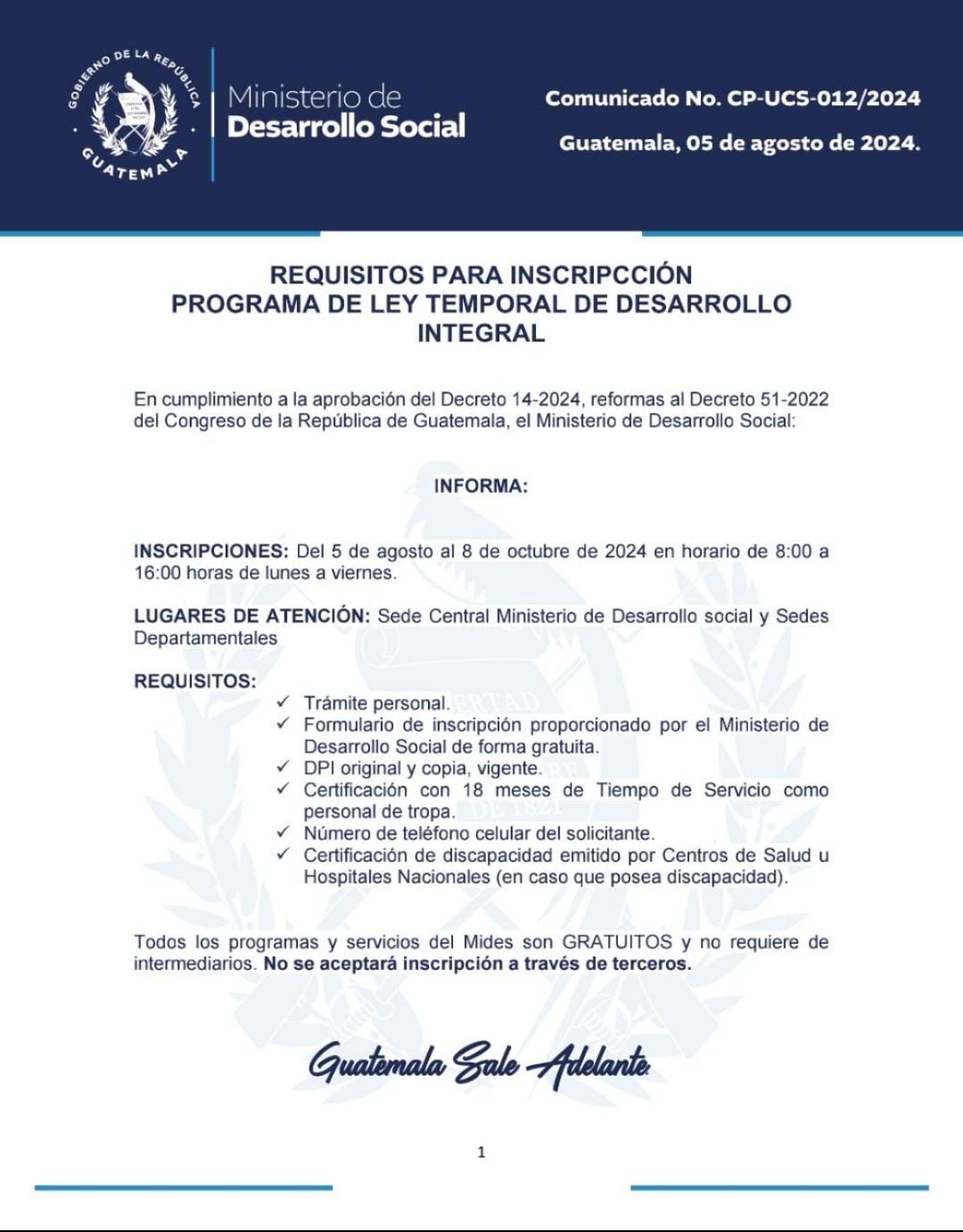 Se informa que la documentación para inscribirse al Programa de Desarrollo Integral se estará recibiendo únicamente en la Coordinación Departamental del MIDES en San Benito, Petén.