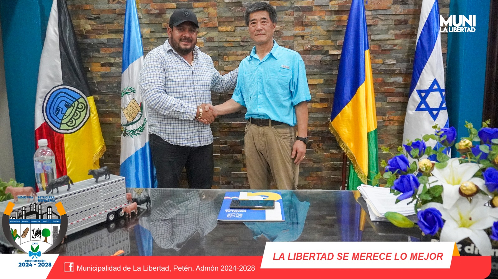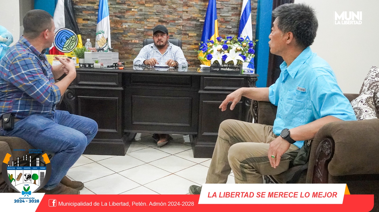En las instalaciones del Despacho Municipal El Sr. Alcalde Municipal Yony Maldonado Calderón recibió la visita del Excelentísimo Sr YUEH LUN TU CHEN de la embajada de Taiwan en Guatemala. El objetivo de esta reunión fue para tratar sobre proyectos de Cooperación con este ente internacional y la Municipalidad de La Libertad, Petén. Fue una reunión fructífera ya que la embajada de Taiwán se comprometió en apoyar con Proyectos ganadería y el aprovechamiento de Bambú en el municipio de La Libertad.