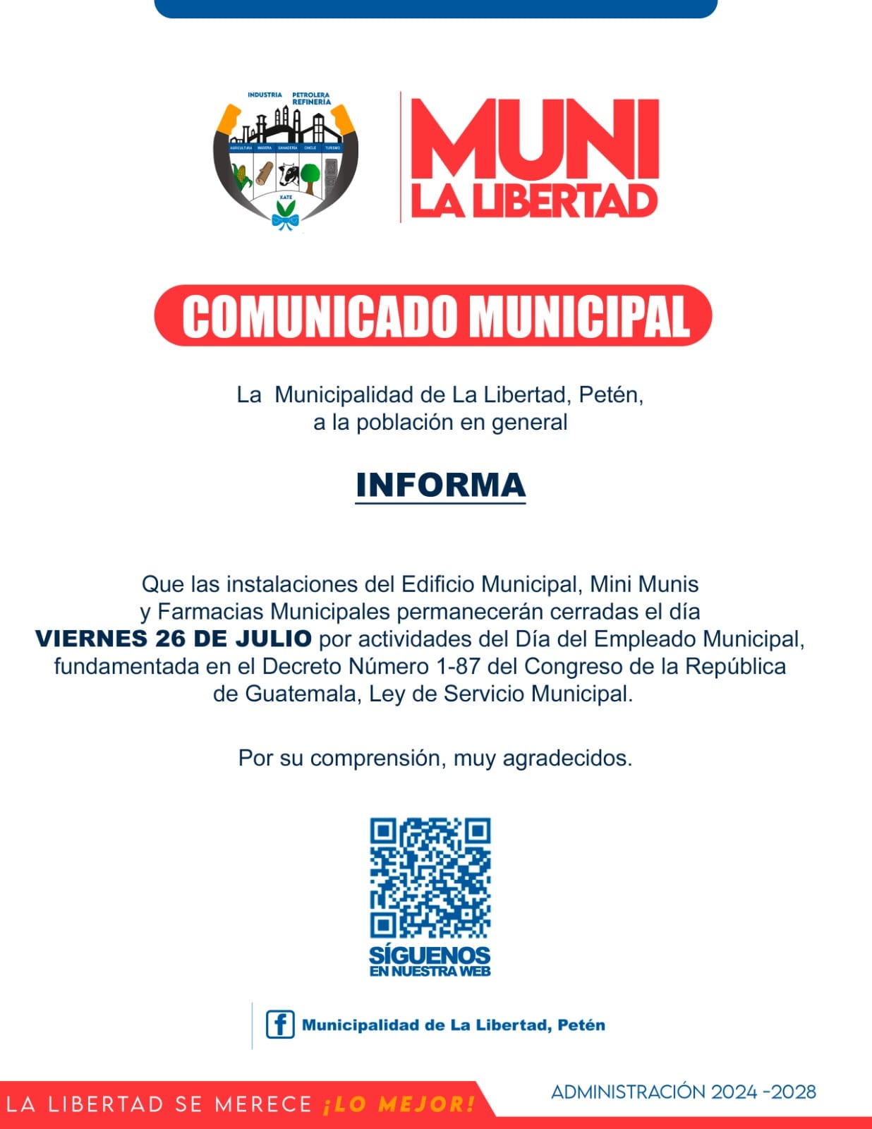 Comunicado Municipalidad de La Libertad, Petén. Admón 2024-2028 INFORMA: Por admin Publicado el 24 julio 2024 Compartir Tweet Compartir Compartir Email Comentarios Relacionado:portada Compartir Tweet Compartir Compartir Email Recomendado Trabajos de Mantenimiento y Apertura de nuevas Calles en Comunidad Poza del Macho Así lucen las calles de Caserío Chinatal, Micro Región #LasRuinas 👉No te Pierdas Todos los Viernes Nuestro Mercadito Campesino✅