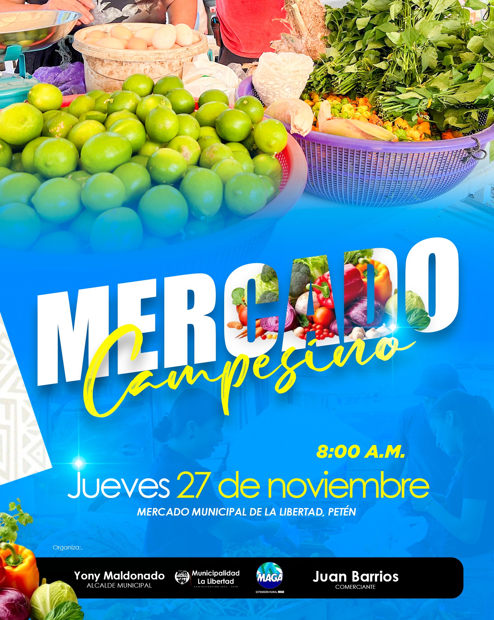 Municipalidad de La Libertad con el apoyo de la Extensión Rural MAGA estarán realizando el Mercado Campesino, una actividad que permitirá a los pequeños productores y agricultores del Micro Región Central ofrecer sus productos y cosechas de la temporada.